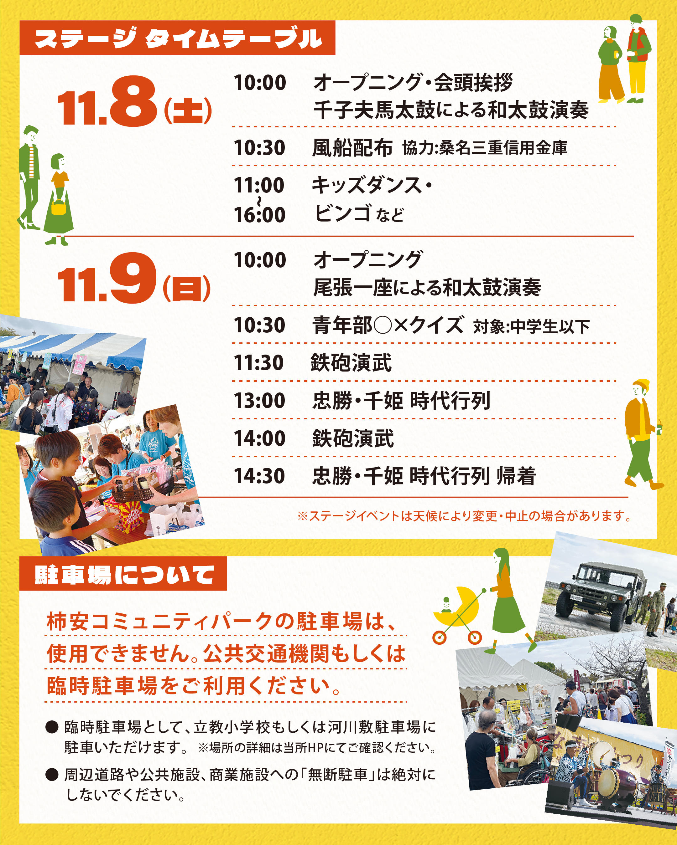 11/8はキッズダンスなどがメイン、11/9は桑名時代まつりがメインとなっており、忠勝・千姫時代行列や鉄砲隊の演武があります。鉄砲隊の演武は昨年桑名市にて初開催され、火縄銃の実演が臨場感がありとてもたくさんの人の歓声を集めていました。今年は2回あるようなので是非ご覧ください。