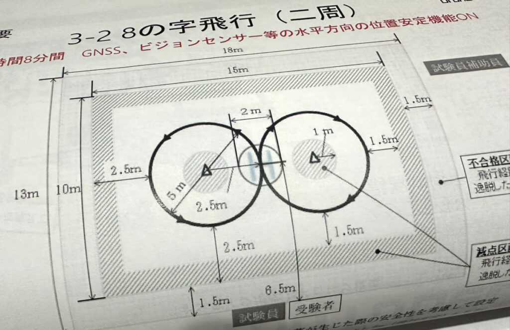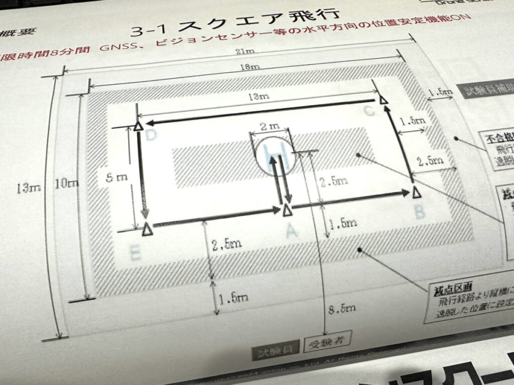 - 実技審査(夜間:スクエア、ATTIモードでの非常事態対応。目視外:スクエア、ホバリング10秒)