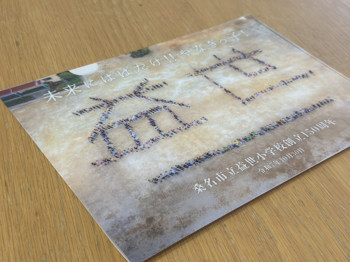 2025年10月30日で創立150年を迎えた桑名市立益世小学校にてドローン空撮を行いました。人文字を撮影したものをクリアファイルとして作成し、また150周年記念動画の作成もお手伝いさせていただきました。
